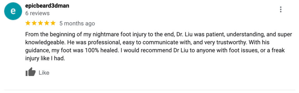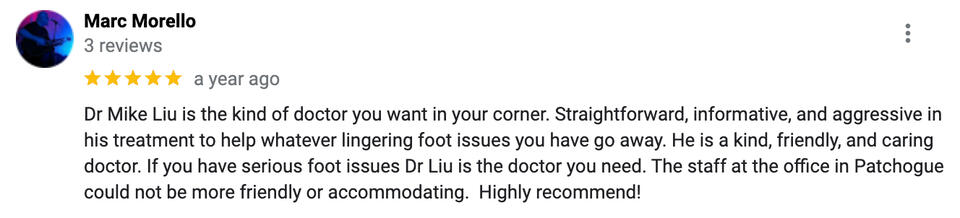 Dr. Gaston Mike Liu is a board certified podiatrist based in Commack and Nesconset. After treating patients for many years in his private office, performing foot and ankle surgeries on patients, and treating patients in the comfort of their own homes, Dr. Liu realized there is a great need for his services to be rendered both in office as well as convenient house calls. Dr. Liu would be honored to treat your friends and family!Dr. Liu enjoys spending time with his family, hiking, cooking, and traveling.Gaston Mike Liu, DPM